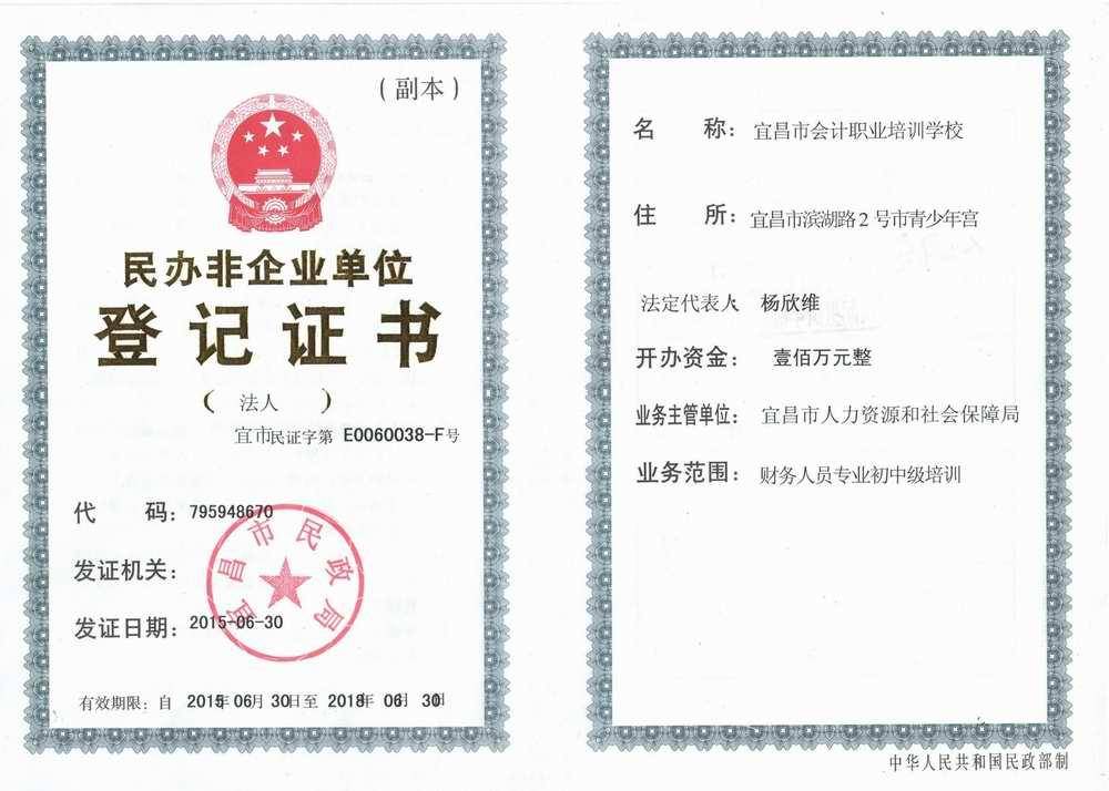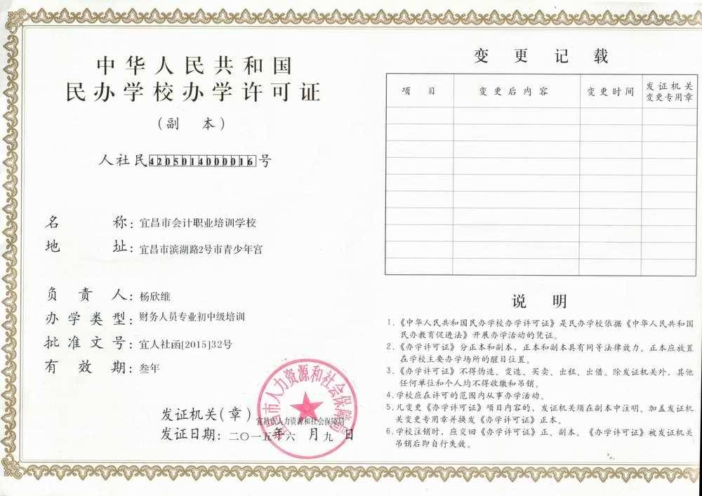中华人民共和国办学许可证号:4205014000016 民办非企业单位登记证书:宜民字第E0060038-F 代理记帐经营许可证号:420500007